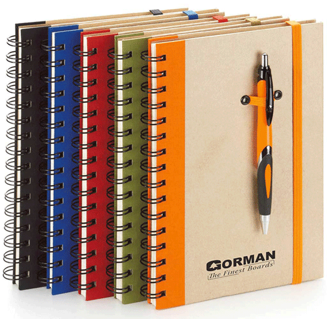 Recycled cardboard journal book made of journals with clored fabric trim. Elastic closure and pen loop match the fabric trim color. 80 sheets of ivory ruled paper that is made of 72% recycled materials. Push-action ball-point pen has a colored barrel, matching accent and chrome trim. Corn starch black or silver clip and comfort grip. Medium point; blue ink.