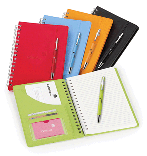 Spiral bound notebook cover is made of NeoSkin. Elastic pen loop (Matching plastic push-action ball-point pen included). Large document pocket and 3 business card pockets on the inside. 96 perforated ruled ivory sheets.